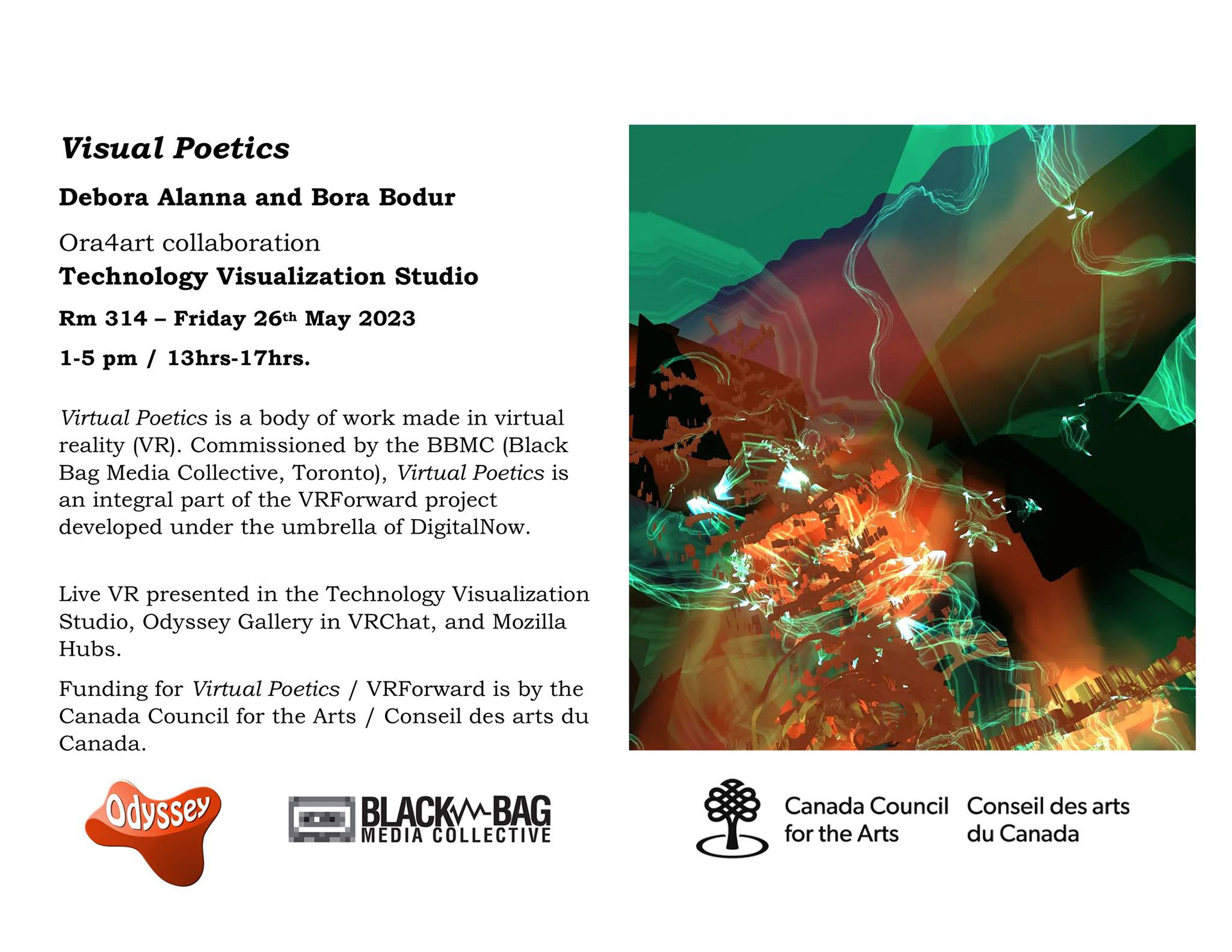 Ora4art in the Odyssey gallery in VRChat by Bbmctoronto, commissioned for VRForward DigitalNow, funded by Canada Council for the Arts and produced in the Technology Visualization Studio. Collaborative work with Inventosolutionist Excupid, Embellish4art, Barry Chabala, Lance Austin Olsen, Tyr Jami, Roy Green