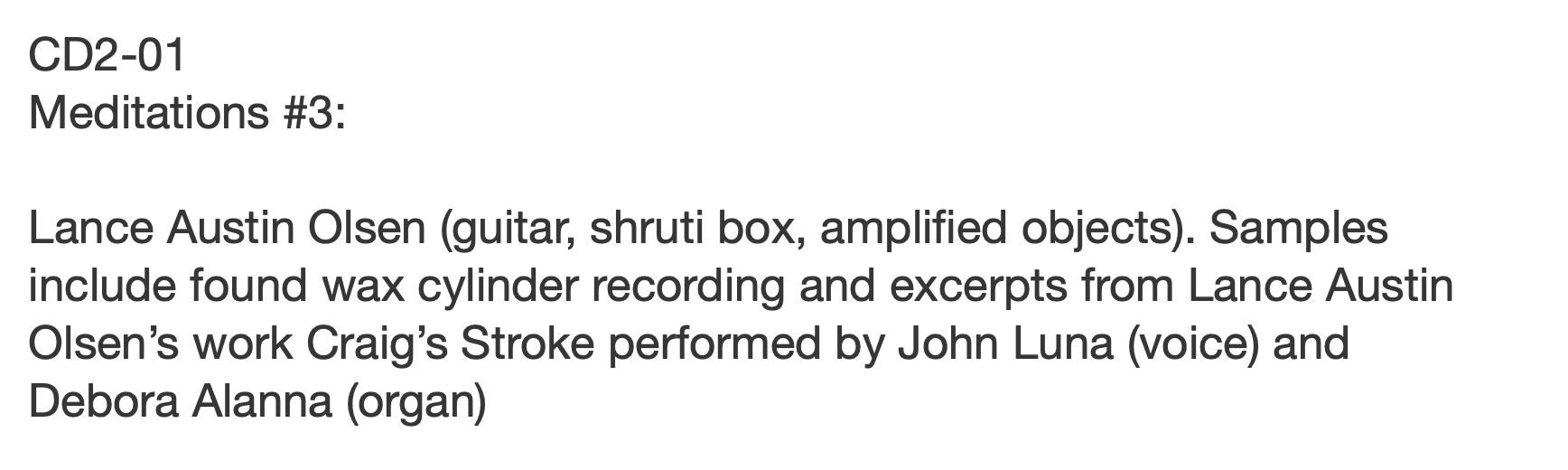 Works on Paper - CD2-01. Meditations #3 Collaboration with John Luna, Lance Austin Olsen. Published by Elsewhere Records, NJ, USA. 2019